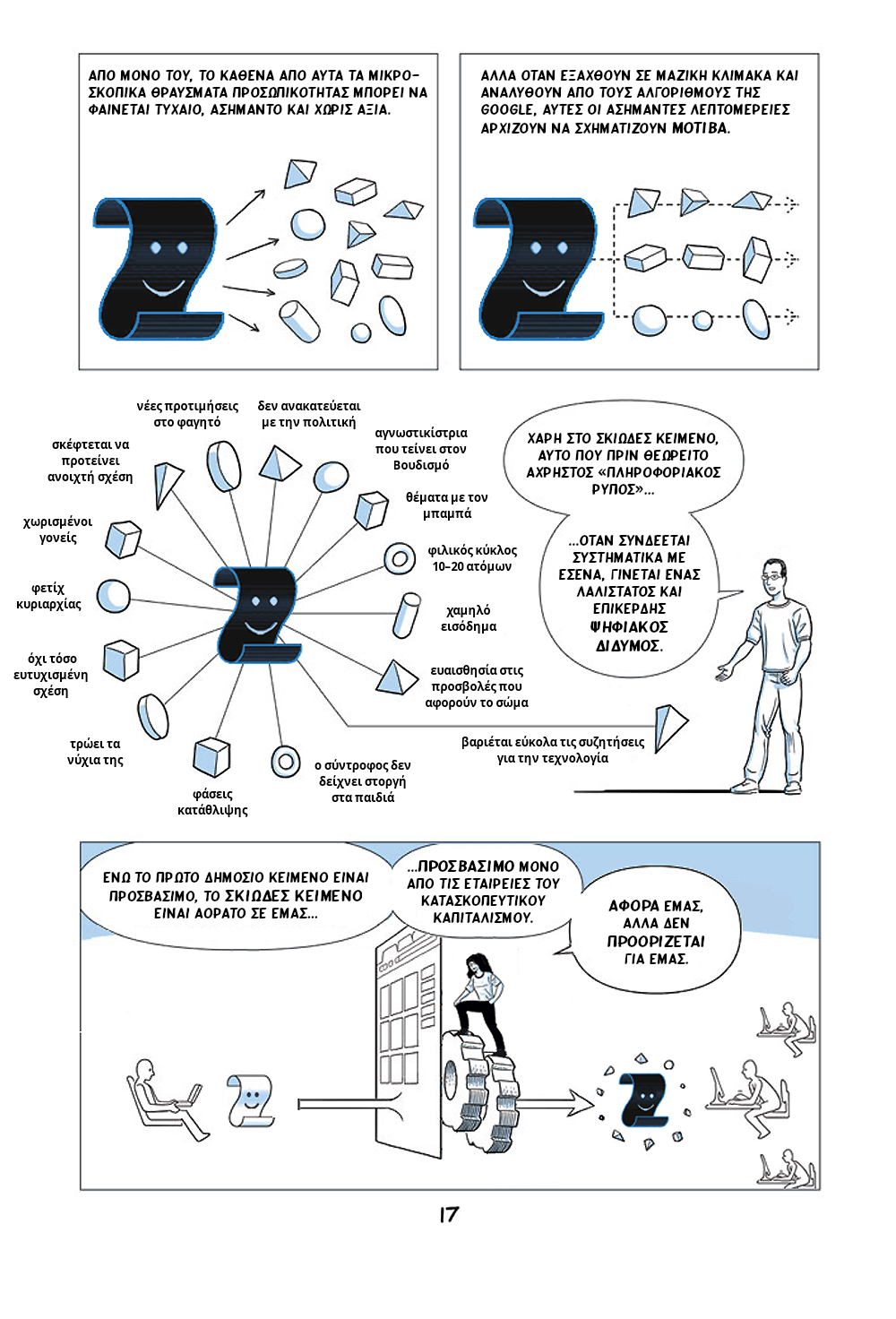 • Ένα παράδειγμα σωματιδίων προσωπικότητας που προέρχονται από το σκιώδες κείμενό σας θα ήταν το «like» στο Facebook, όπως έδειξε μια εργασία των Μίχαλ Κοζίνσκι, Ντέιβιντ Στίλγουελ και Θορ Γκέπελ του 2013 (την οποία παραθέτει και η Ζούμποφ στη σελ. 274): Τα «like» του Facebook θα μπορούσαν «να εκτιμήσουν αυτόματα και με ακρίβεια ένα ευρύ φάσμα προσωπικών χαρακτηριστικών που οι άνθρωποι συνήθως θεωρούν ότι είναι ιδιωτικά», μεταξύ των οποίων ο σεξουαλικός προσανατολισμός, η εθνικότητα, οι θρησκευτικές και πολιτικές πεποιθήσεις, τα χαρακτηριστικά της προσωπικότητας, η νοημοσύνη, η ευτυχία, η χρήση εξαρτησιογόνων ουσιών, το διαζύγιο των γονέων, η ηλικία και το φύλο.