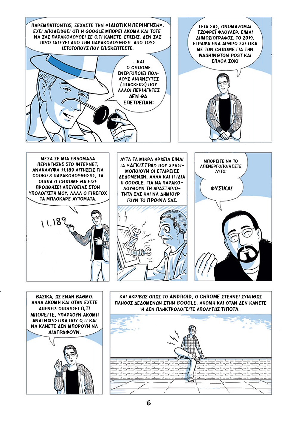 • Δεν θα παραθέσουμε εδώ το link για το πρωτότυπο άρθρο της Washington Post, καθώς ο μόνος τρόπος να το δει κανείς πίσω από το paywall περιλαμβάνει τη διεξοδική σας παρακολούθηση· μπορείς να βρεις τα επιχειρήματα του Τζόφρεϊ Φάουλερ και εδώ (μερικά από τα οποία χρησιμοποιούνται απευθείας στο κόμικ): https://www.newstalkzb.co.nz/lifestyle/technology/geoffrey-fowler-why-googles-web-browser-has-become-spy-software/